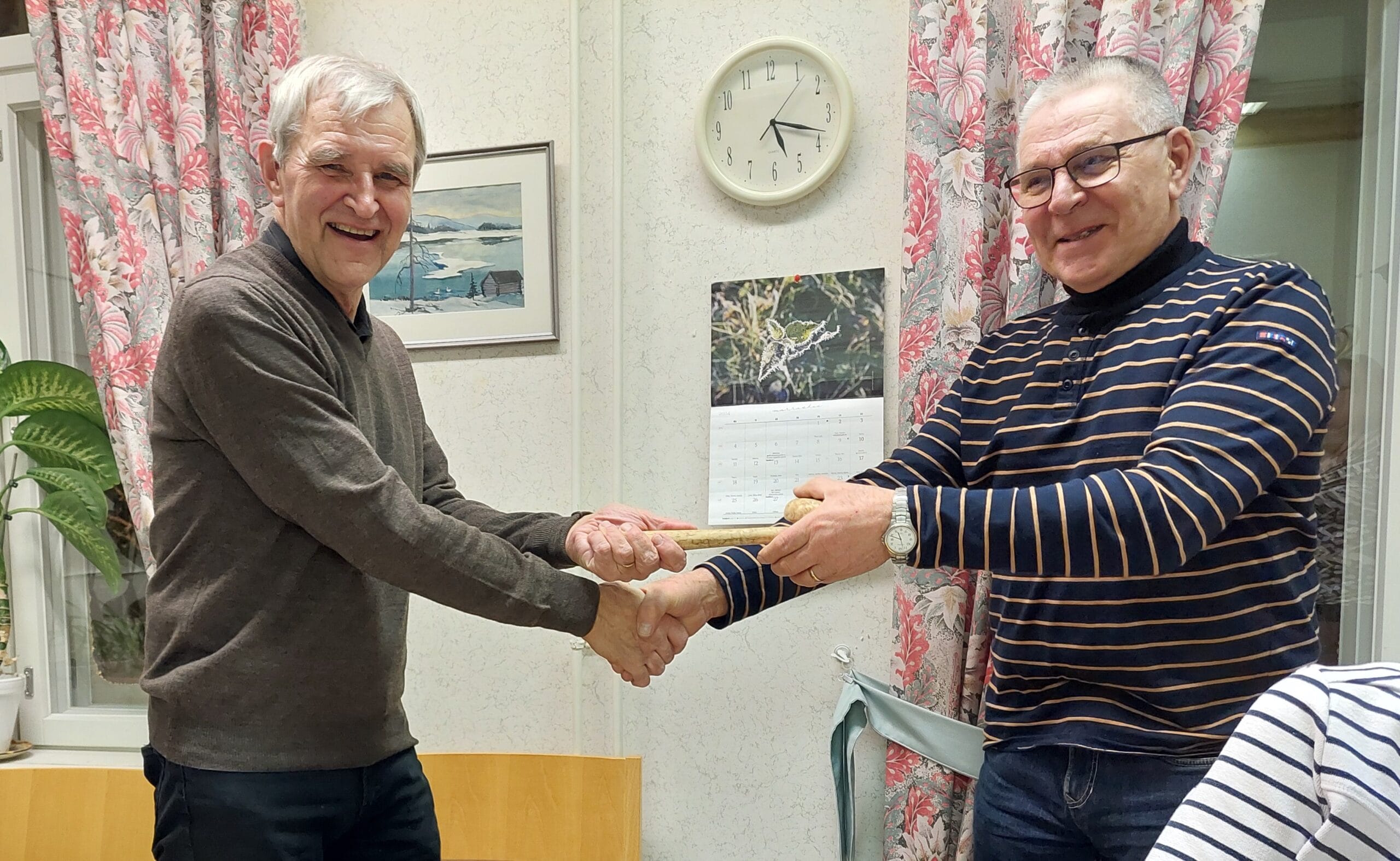 Kimmo Nevavuori (kuvassa vasemmalla) saa puheenjohtajan nuijan Mauri Viinikkalalta.