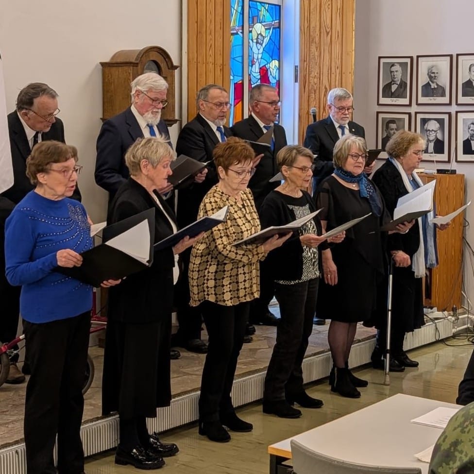 ”Laulaen iloa saamme, sitä myös toisille jaamme. Hetkinen siis laulakaamme, musiikki yhteistä on”.